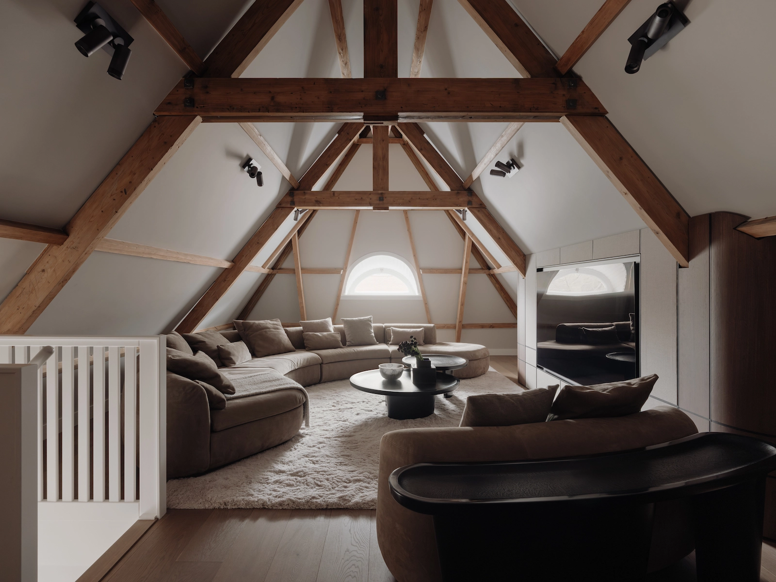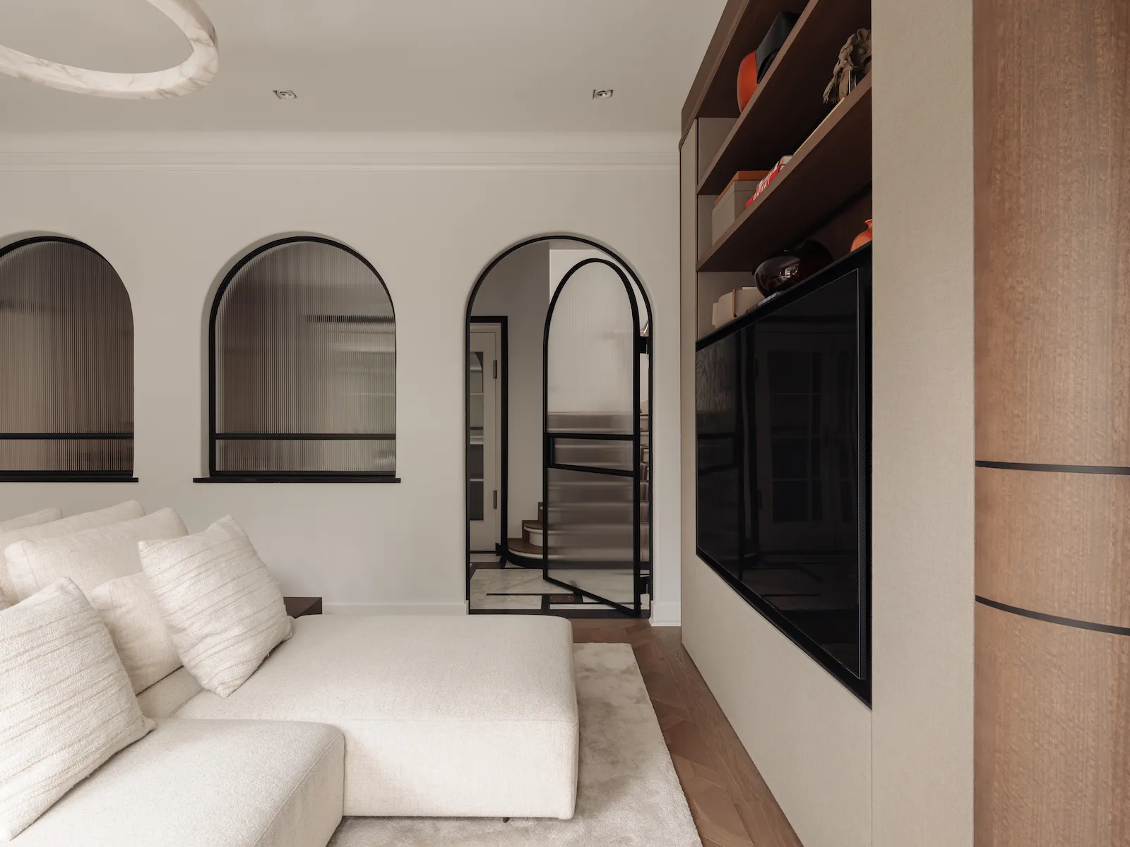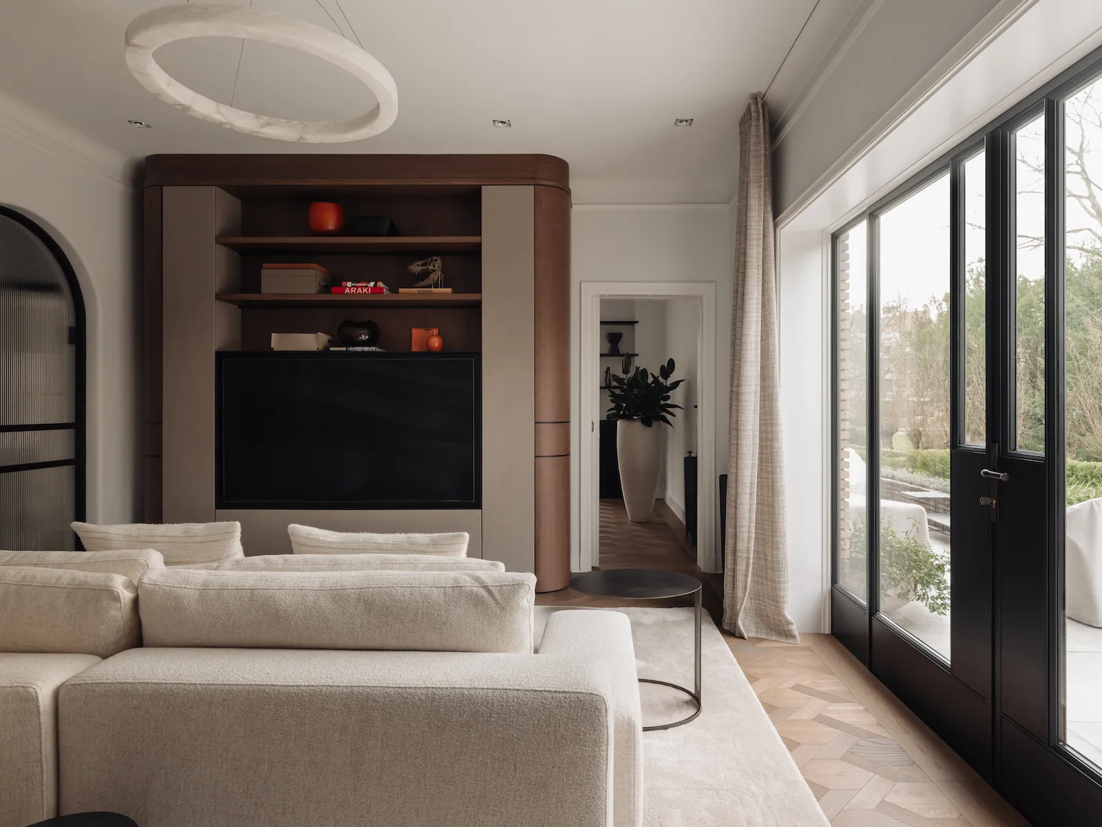 Door de gehele woning zijn meerdere audiozones gerealiseerd met Wisdom Audio luidsprekers en inbouwsubwoofers, aangevuld met Sonance in-stuc luidsprekers in geselecteerde ruimtes. Televisies zijn subtiel opgenomen in het maatwerk interieur, zonder afbreuk te doen aan de architectuur. Verlichting en klimaatregeling zijn uitgevoerd met Lutron en KNX, inclusief integraties met het alarmsysteem. De bediening is centraal, intuïtief en elegant vormgegeven via Savant.