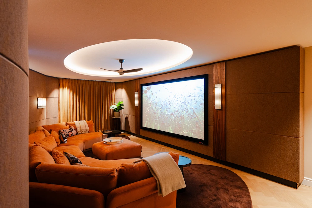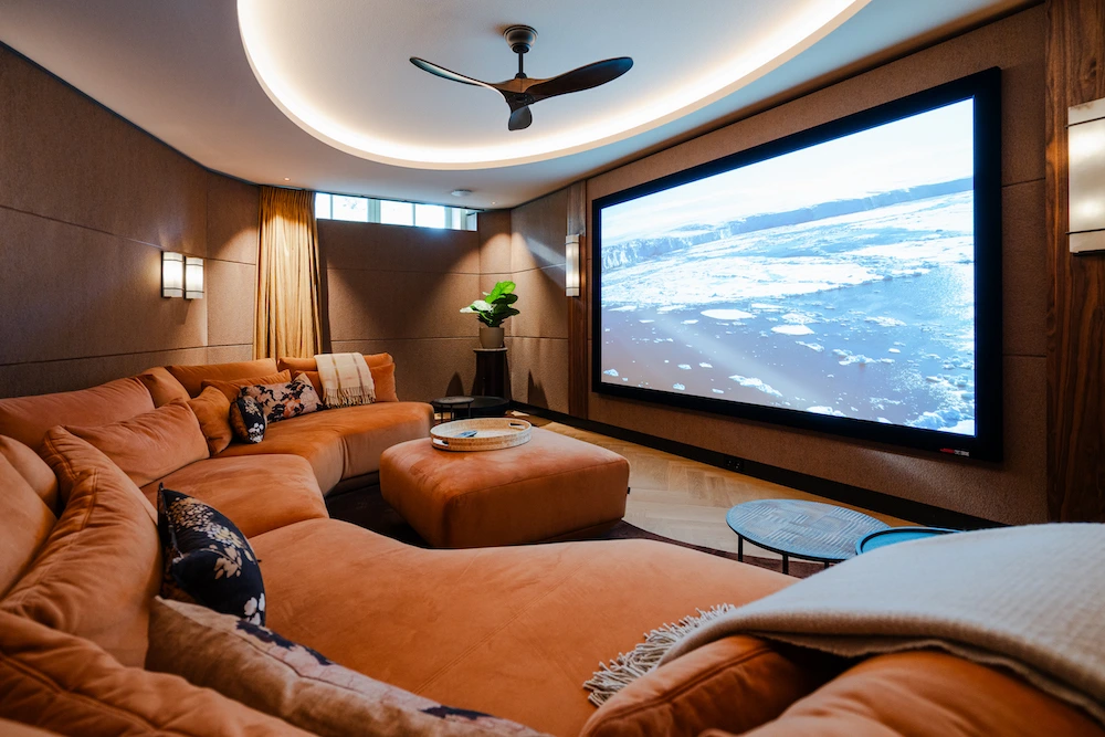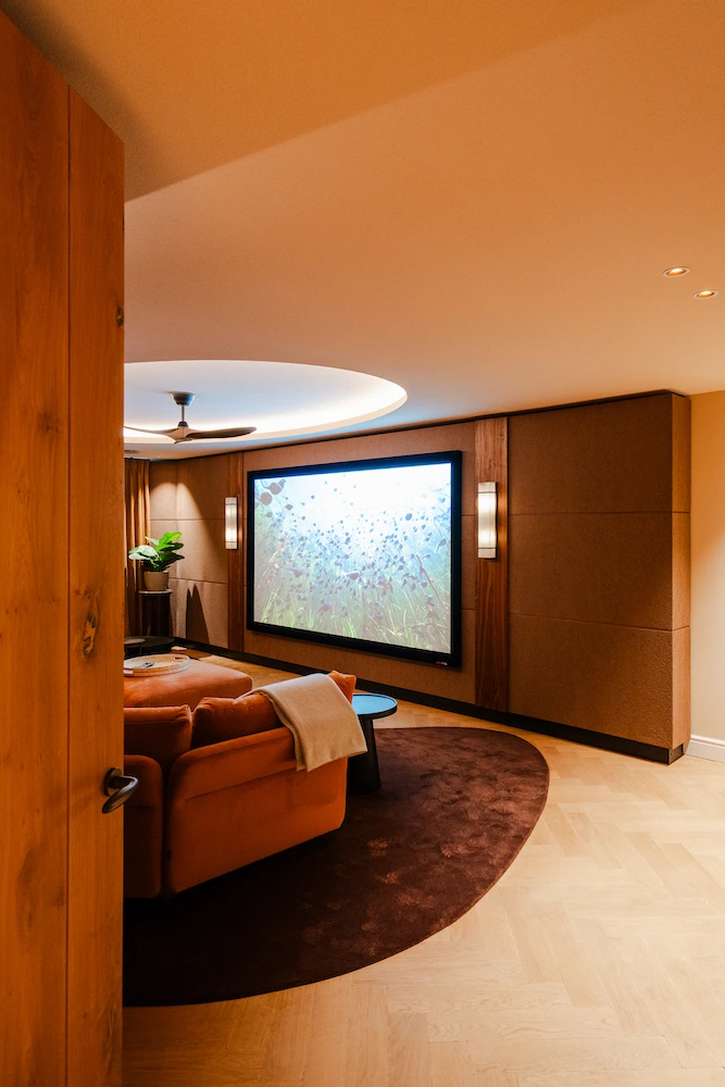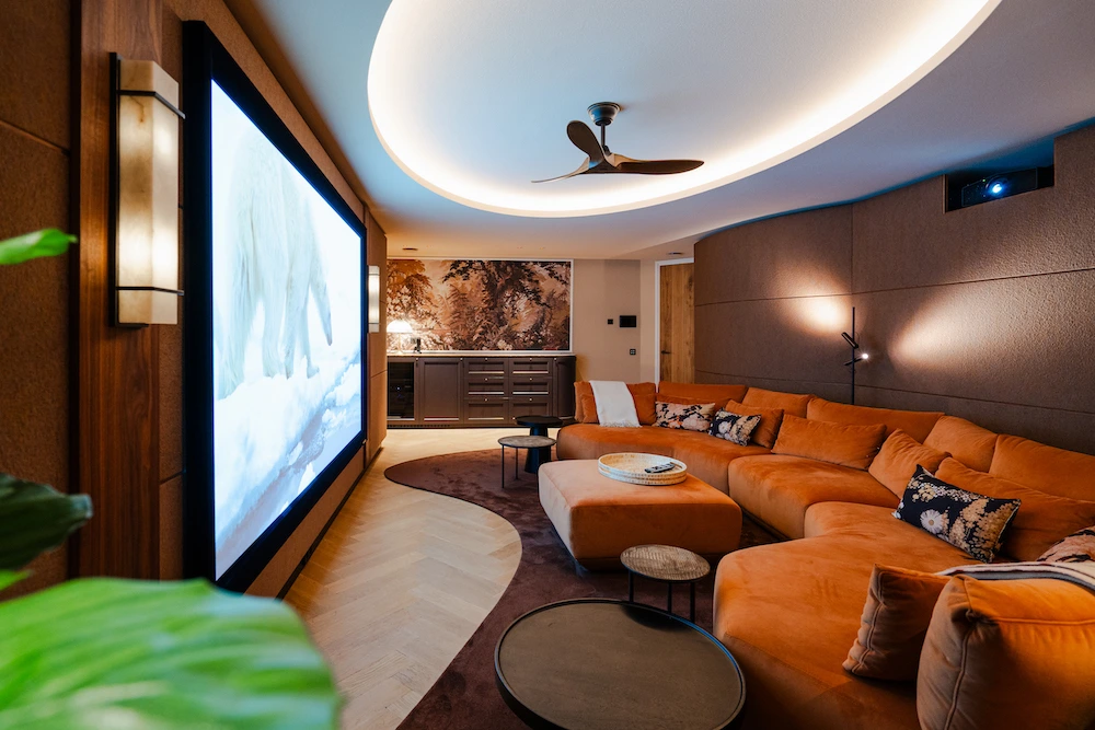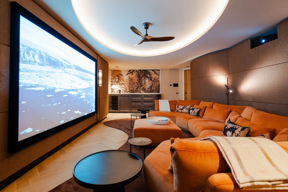 Op de foto’s is de Dobly Atmos custom made bioscoop te zien, die in samenwerking met de interieurarchitect van de villa is ontworpen. In de bioscoop zijn onzichtbaar de negen speakers en twee subwoofers van Wisdom Audio ingebouwd. Een akoestisch transparant 4K projectiescherm en een high-end Sony laser projector zorgen iedere keer weer voor een onvergetelijke ervaring.